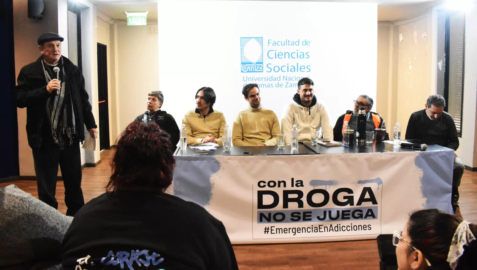 En el auditorio “Rodolfo Walsh” de la Facultad de Ciencias Sociales, un panel integrado por Facundo Pascutto, Secretario de Relaciones Institucionales de la Facultad de Ciencias Sociales de la UNLZ; el concejal de Lomas de Zamora, Juan Montaña, Iñaki Mato (Organización Aconcagua), César Perri (Punto de Encuentro – FOC), Melina Pelayo (MTE) y Luis Suárez (Vida Nueva) describió el cuadro de situación, los esfuerzos y los trabajos de cada área, y los desafíos en la temática, invitando a los vecinos de la región e instituciones a sumarse a la campaña y reafirmar: #ConLaDrogaNoSeJuega Además, rechazaron el concepto despectivo “fisura”, utilizado últimamente por algunos sectores políticos para referirse a las personas que sufren las adicciones.